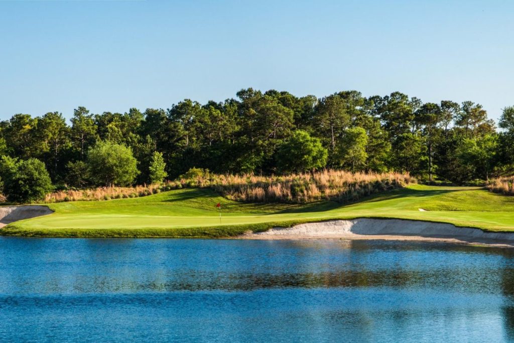 True Blue Golf Club will be a fantastic host for this year’s Super Bowl Golf Classic. Our Mike Strantz design has large bunkers, sloping greens and magnificent water features – all of which are put on display on holes like the par-five 4th hole. This long par five wraps around a large lake with bunkers off the left side of the fairway that run into said lake. The layup area is surrounded by waste areas that you must avoid in order to get the ball close. The green slopes from back to front, and players will be able to use the contours to set up a nice birdie.